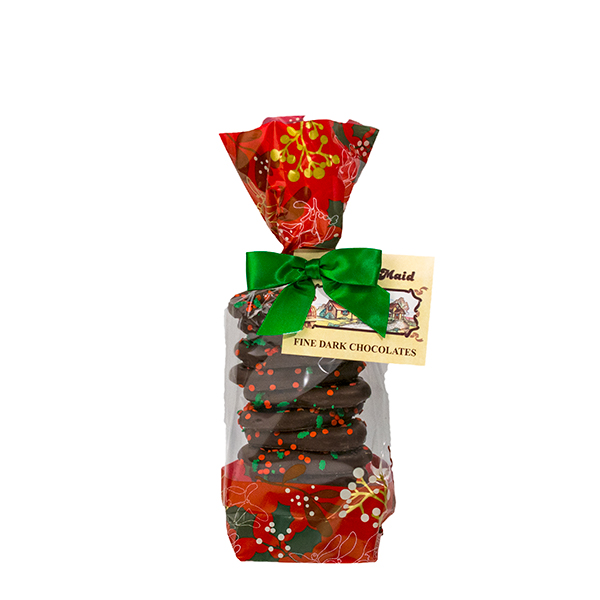 Freshly baked Pennsylvania Dutch pretzels smothered in Premise Maid's signature chocolate sprinkled with edible Holiday sprinkles.