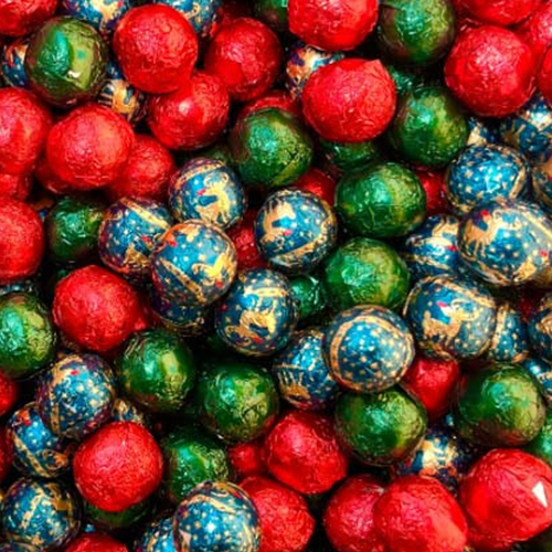 Each rich, dark chocolate ball is wrapped in cheerful, festive foil, making them a perfect addition to any holiday celebration.