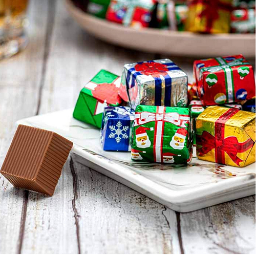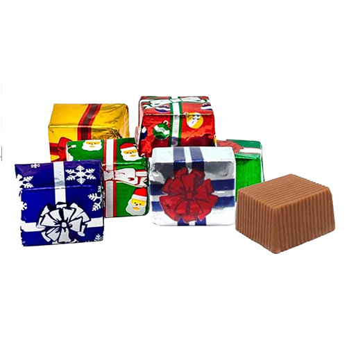 Bite sized, solid premium milk chocolate presents, wrapped in assorted Italian foils, featuring gift wrap designs. Great for filling giftware or party favor items, Christmas stockingsor as table decorations.