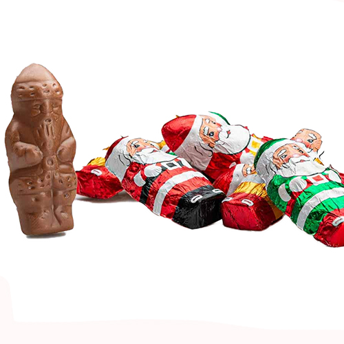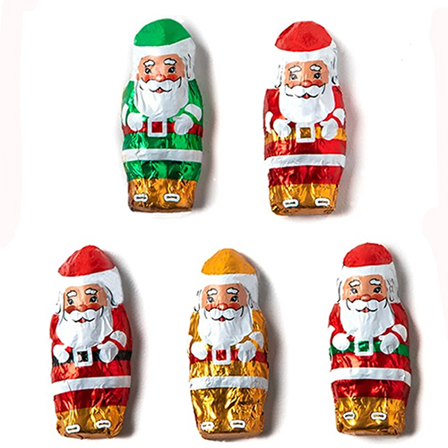 Bite sized, highly detailed, solid premium milk chocolate Santas, wrapped in Italian foil featuring assorted designs. Great for filling giftware or party favor items, candy jars, Christmas stockings or table decoration.