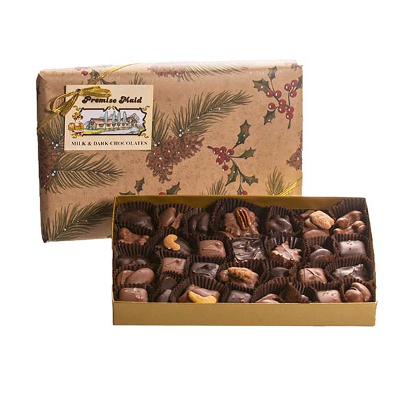 You'll find cashews, pecans, vanilla caramels, almonds, sea salt caramels, cashew turtles and brazils in this assortment. It's a collection of our best nuts and chewy caramels drenched in Premise Maid's signature milk and dark chocolate.