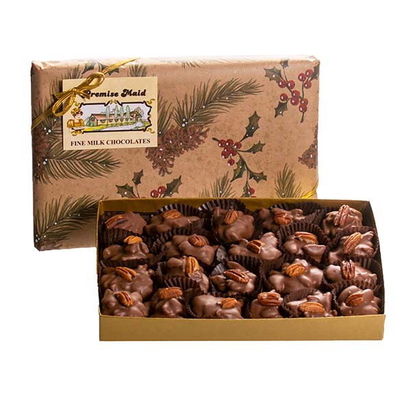 Vanilla caramel swirled in with crisp pecans enrobed in a thick layer of Premise Maid's signature milk chocolate.