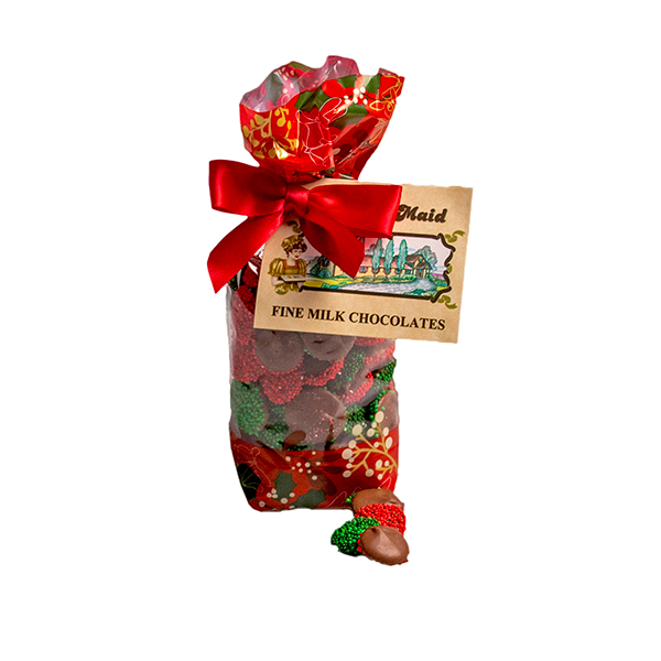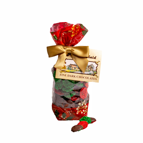 Velvety smooth Premise Maid signature chocolate wafers dotted with dozens of tiny red and green sugar dots.