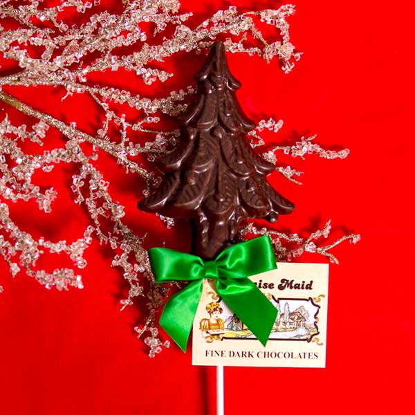 The perfect stocking stuffer for kids and adults.  Measureing about 4 inches by 5-1/4 inches tall.  Our Chocolate Tree loliipops come cello-bagged and tied with a beautiful Holiday bow.