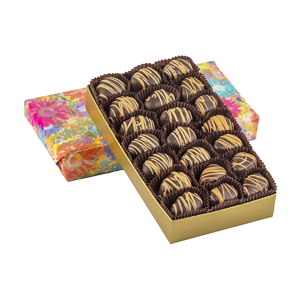 A smooth dense peanut butter meltaway center decorated with a peanut butter drizzle.