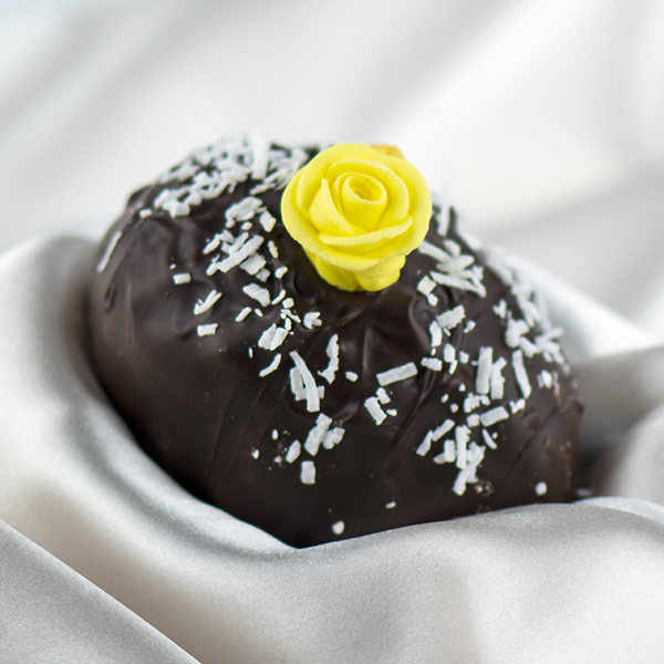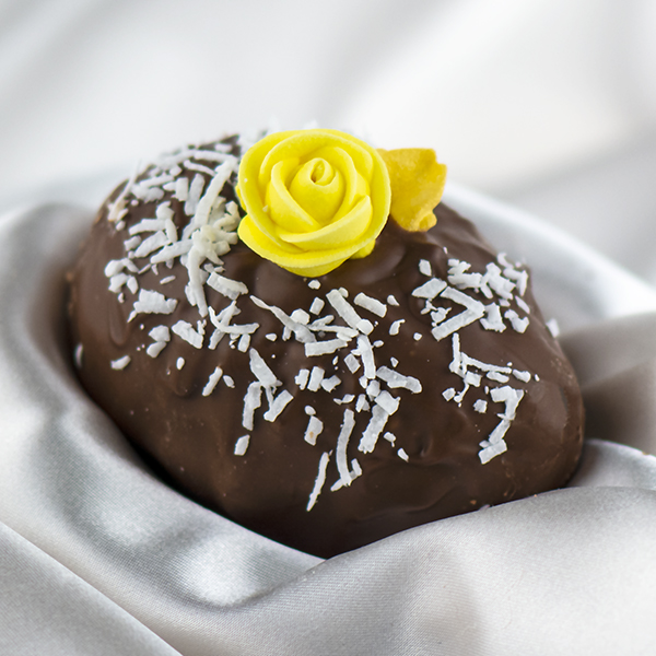 Mounds of shredded coconut in a clear sugar syrup, drenched in Premise Maid's signature chocolate and decorated with a blend of shredded and flake coconut.