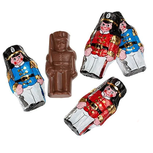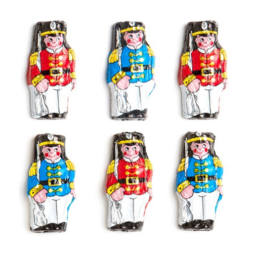 Bite sized, highly detailed, solid premium milk chocolate Soldiers, wrapped in Italian foil featuring assorted designs. Great for filling giftware or Christmas stockings or table decoration.