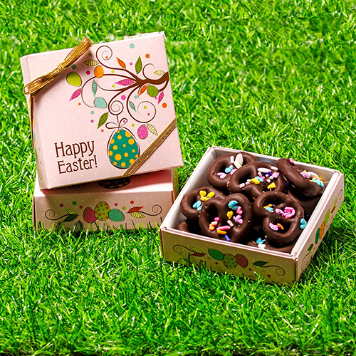 Classic Pennsylvania Dutch pretzels smothered in Premise Maid's signature chocolate sprinkled with edible Spring sprinkles.